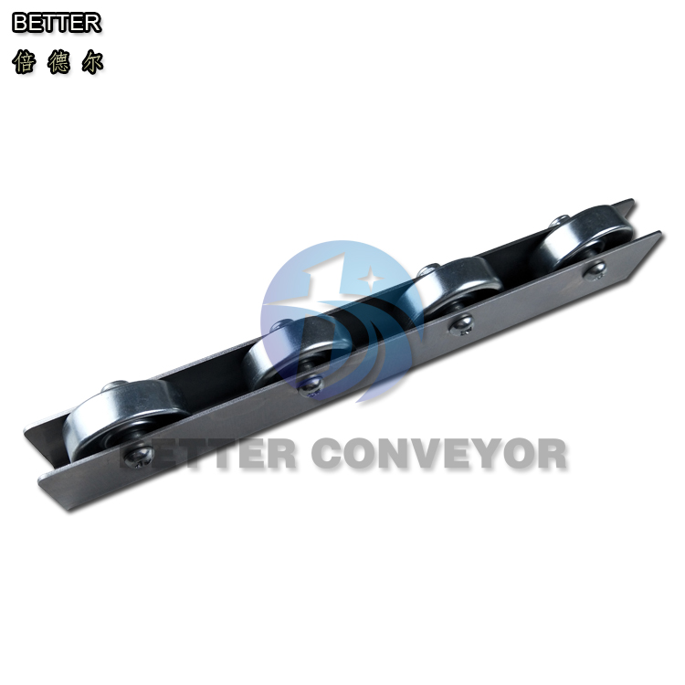 In these conveyors, a series of wheels are mounted to a variety of conveyor rail shapes and with various