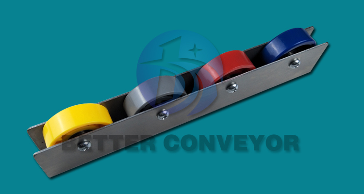 In these conveyors, a series of wheels are mounted to a variety of conveyor rail shapes and with various